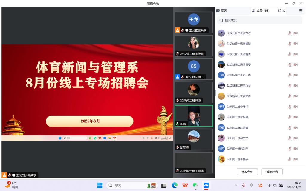 8月27日,体育新闻与管理系线上招聘会圆满结束。本次活动特邀2008届优秀校友陈蓓重返云端校园,为我系大三、大四学子带来一场干货满满的成长分享,助力学子明晰职业方向,汲取前行力量。