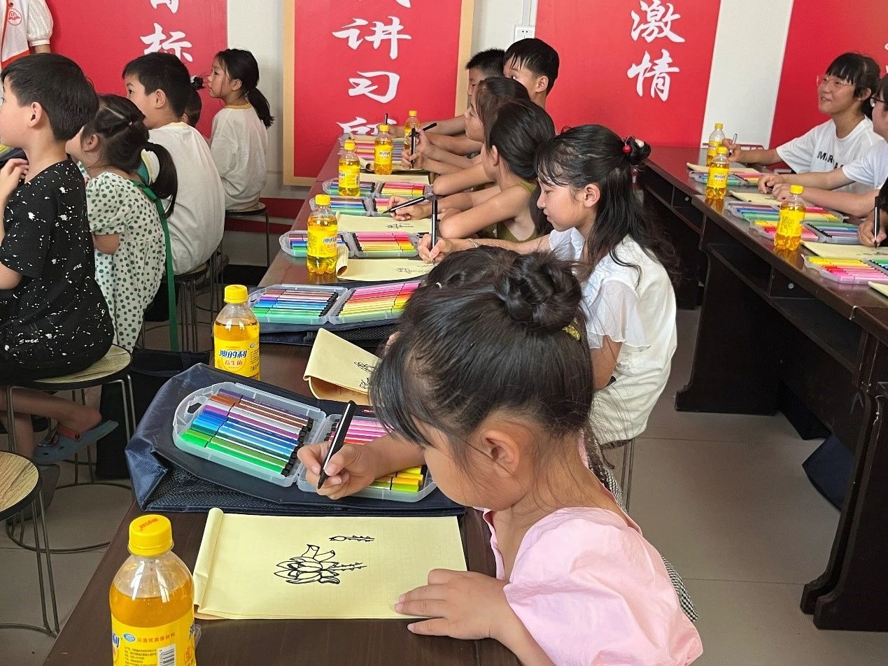 志愿者们在美术课上教孩子们画荷花