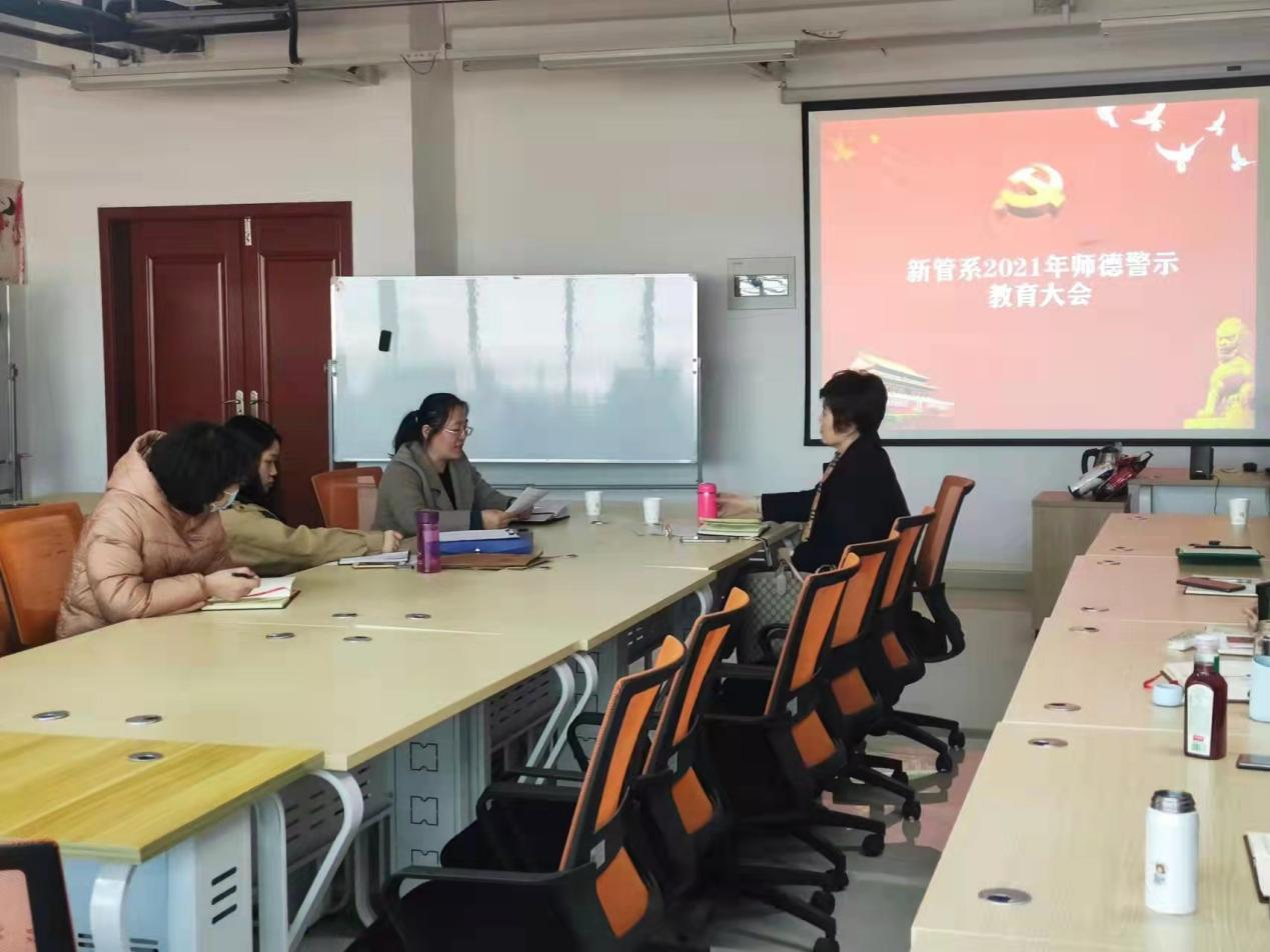 为进一步增强教师爱岗敬业、教书育人的职业责任感,加强全体教师师德师风建设,强化教师文明执教、规范执教、廉洁执教的意识,2021年11月23日下午,新管系在图文信息楼617召开了2021年师德警示教育大会。新管系全体教职工参加会议。新管系党总支书记赵环同志主持会议。