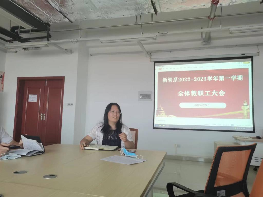 2022年8月26日,新管系在图文信息楼617教室召开全体教职工会议。新管系全体教职工参加,新管系主任邓峰同志主持会议。