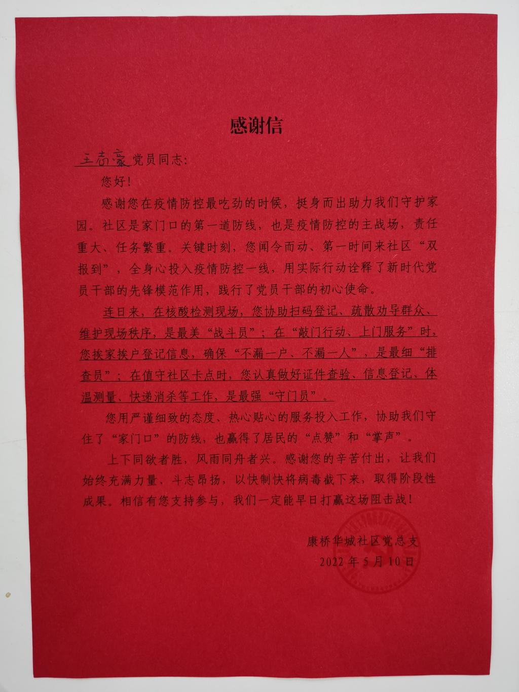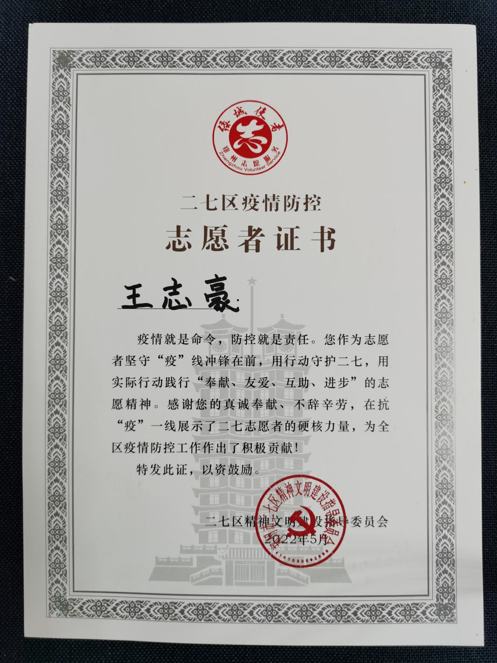 近日,我市疫情防控形势严峻复杂,为全力配合做好疫情防控工作,科学有序开展疫情防控志愿服务行动,5月4日我院党委组织部发出《郑州大学体育学院致全体师生党员入党积极分子疫情防控倡议书》,我系教师党员王志豪第一时间响应号召,在疫情最吃紧的时候,挺身而出助力守护社区,筑起家门口的第一道防线,用实际行动诠释了新时代党员干部的先锋模范作用,践行了党员干部的初心使命。疫情防控志愿服务工作5月10结束,所在社区康桥华城社区党总支向王志豪老师发出感谢信,二七区精神文明建设指导委员会发放二七区疫情防控志愿者证书。