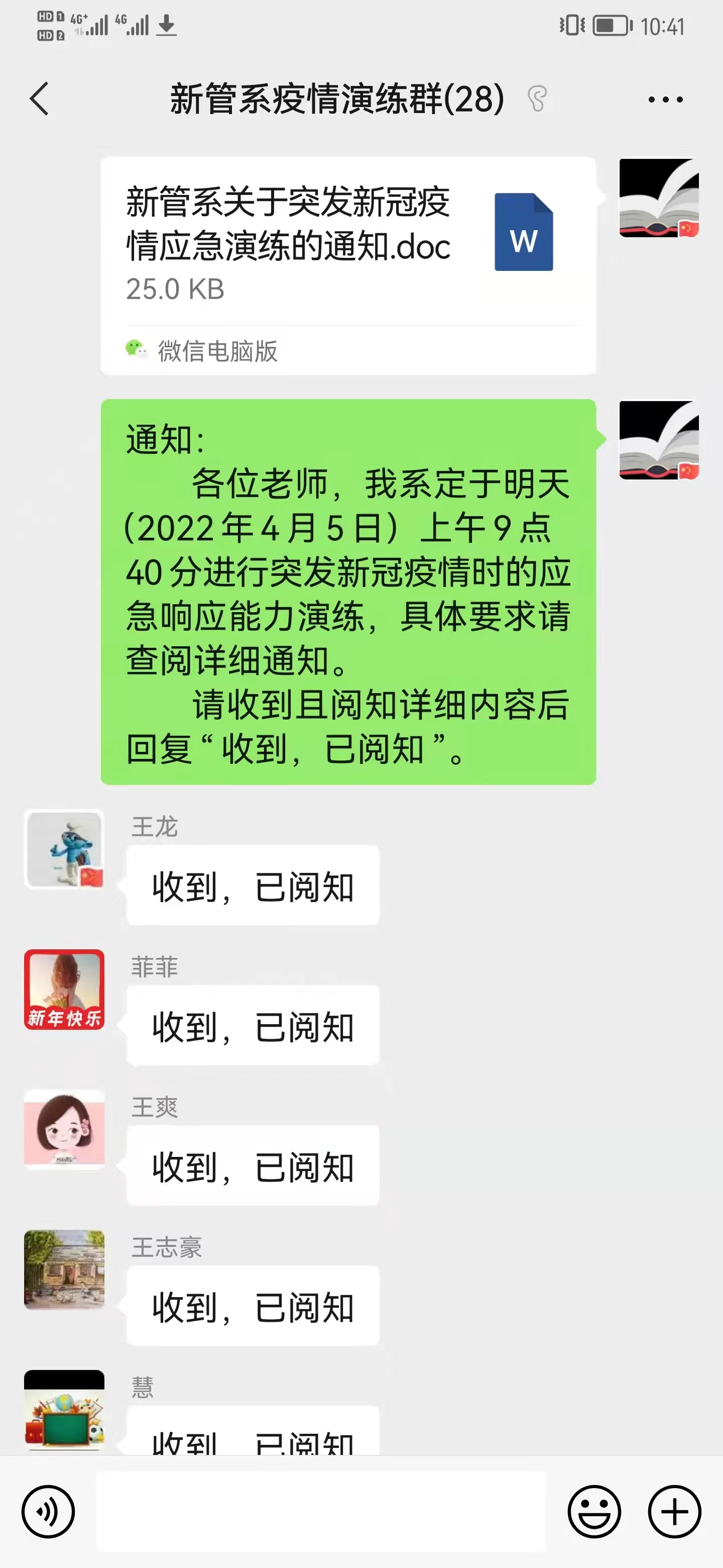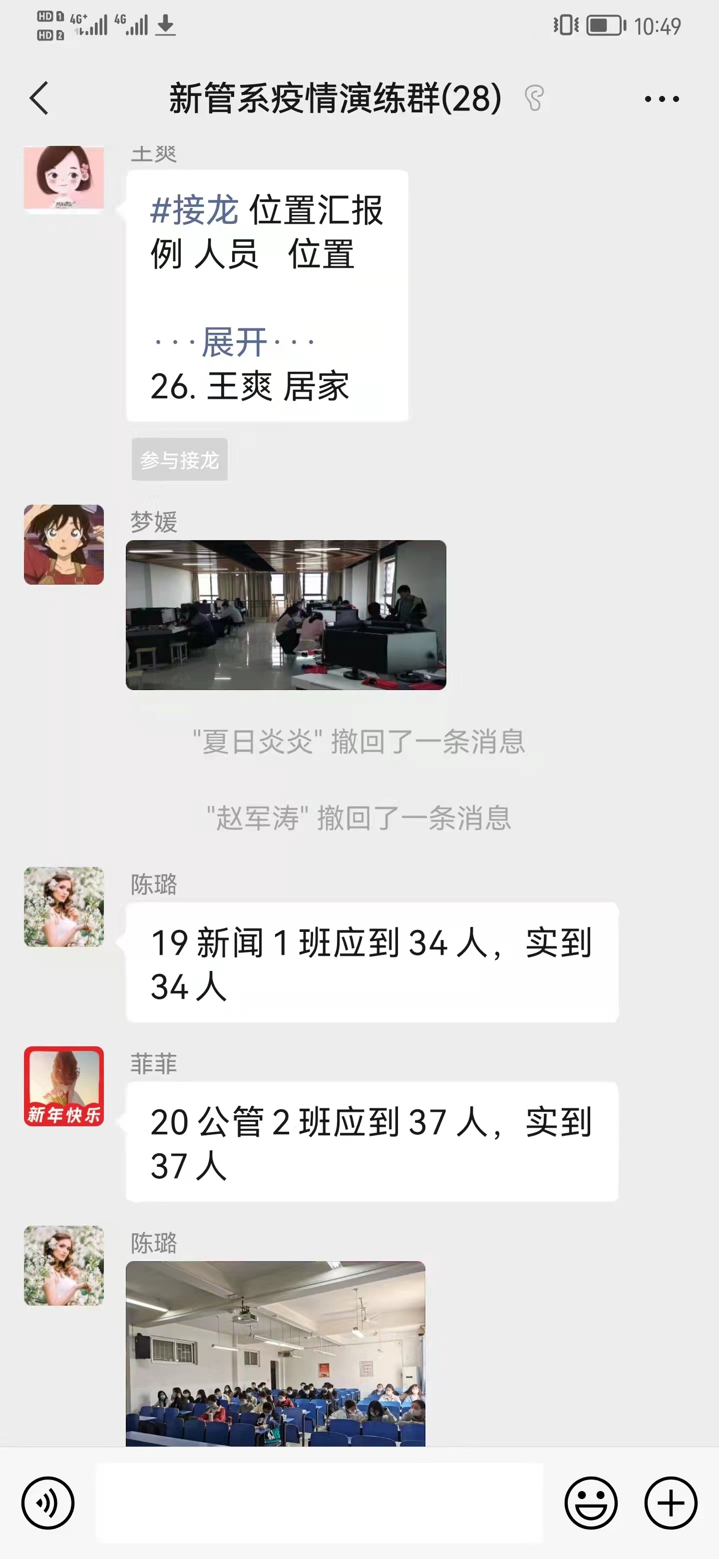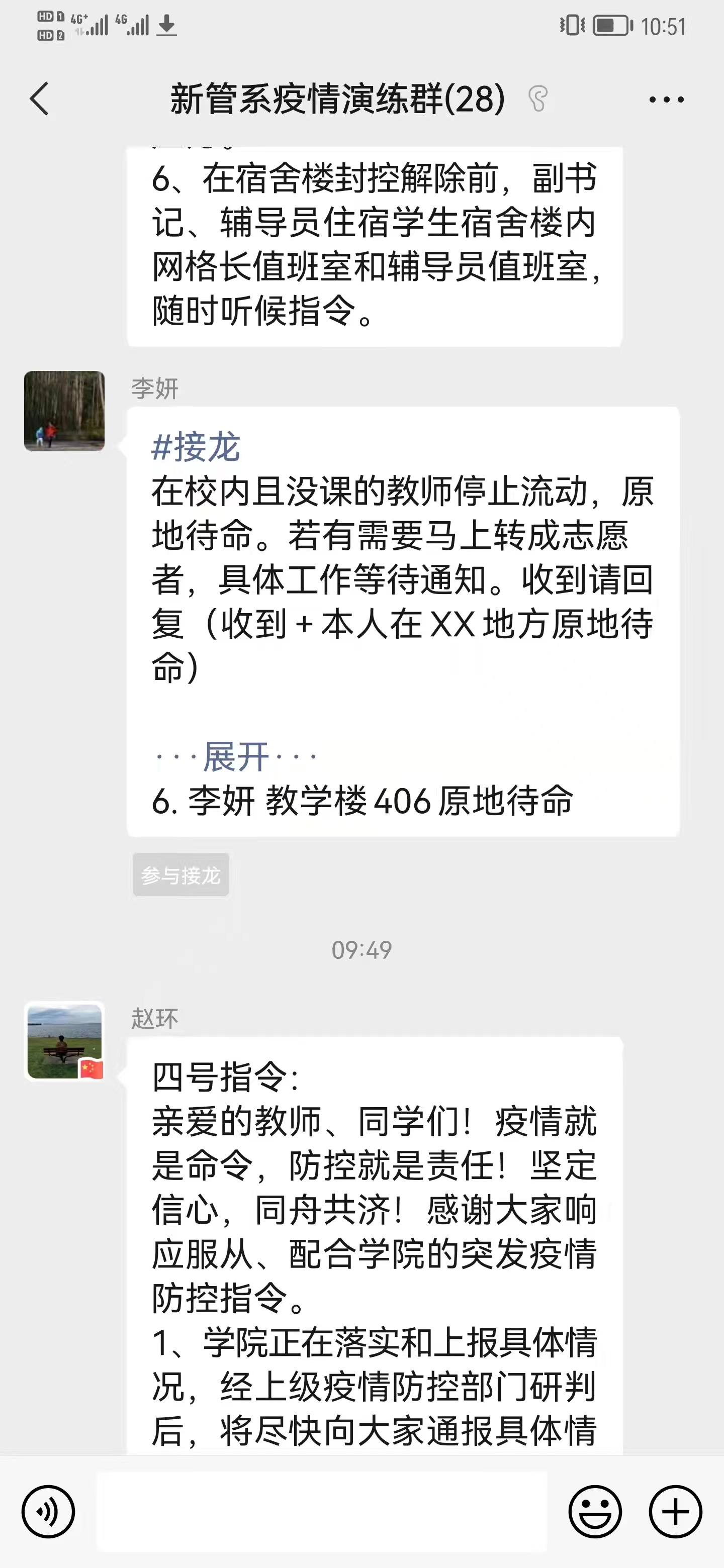 演练活动主要是模拟正常工作的情况下,新管系党总支书记赵环同志发出“突发新冠肺炎疫情防控”指令后,全体教师接到第一指令和接到上级的下一步行动指令之间的工作演练。通过本次演练,使我系全体师生进一步熟悉掌握了“突发新冠肺炎疫情防控应急响应”一小时内的工作步骤和注意事项。演练内容包括:统计师生位置、学生专班人员第一时间前往宿舍、网格长上报学生实时数据信息、教师在课堂上安抚学生情绪和舆情引导等一系列具体操作流程。确保在等待学院新冠肺炎疫情防控指挥部的下一步行动指令前的各项准备工作。