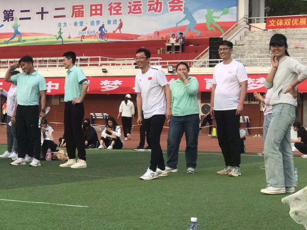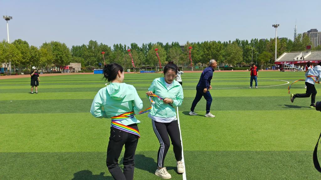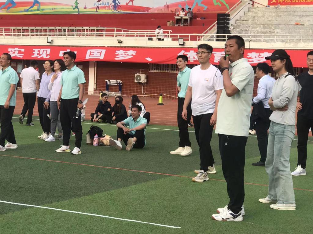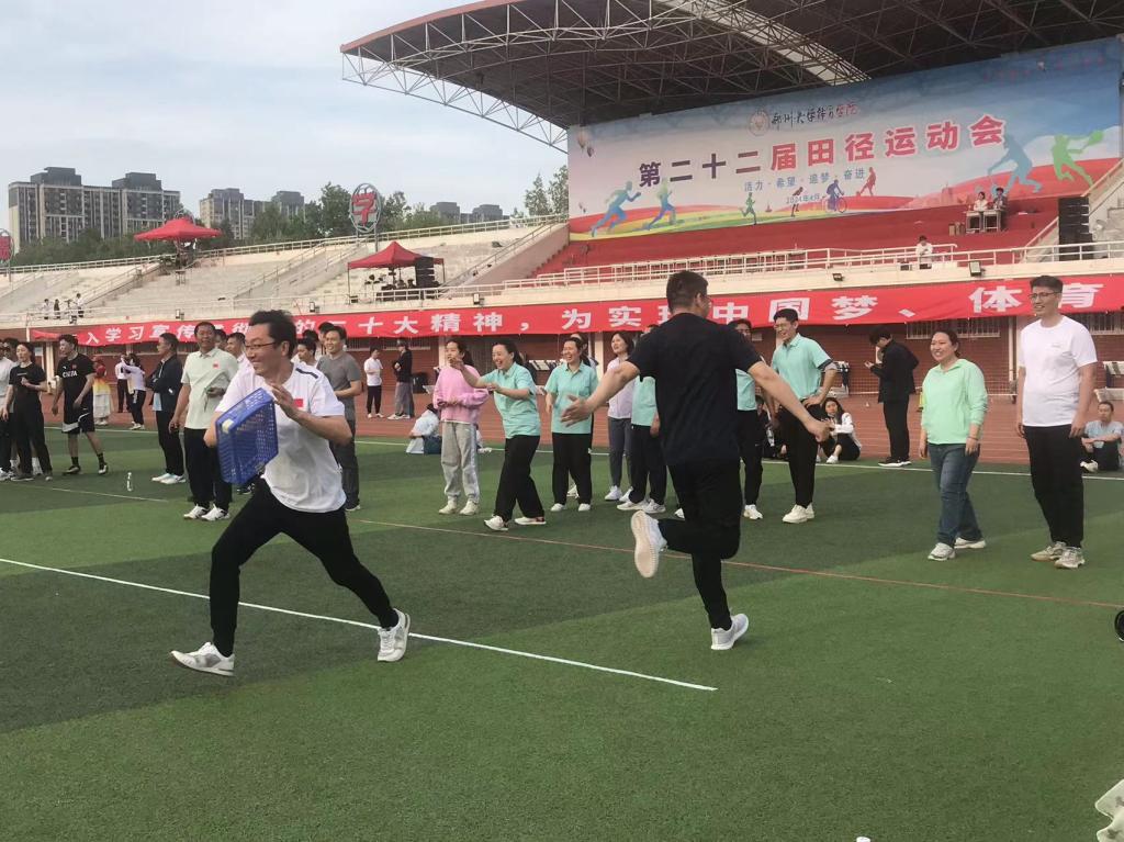 在同学们挥洒汗水的同时,我系老师也在参与我院趣味横生的教职工比赛。老师们各显神通,在工作中他们是携手共进的同事,赛场上,他们是砥砺前行的战友。在上午的魔力转圈接力赛中,老师们腰缠彩带,当跑到下一棒时需要解下自己的彩带缠在对方身上。在这场比赛中,我系陈思琪、王龙、刘兆祎老师取得了第四名。