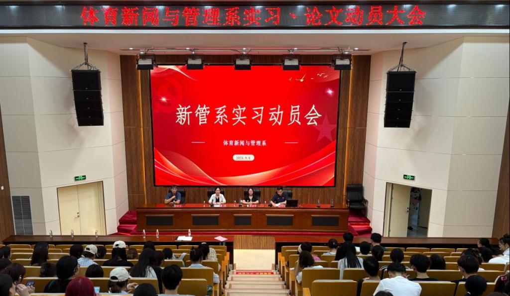 9月6日下午,体育新闻与管理系在图文信息楼报告厅开展实习、毕业论文动员会。体育新闻与管理系党总支书记郜攀峰、系主任邓峰、系党政办公室主管王志豪、2021级辅导员王松及全体学生共同参加会议