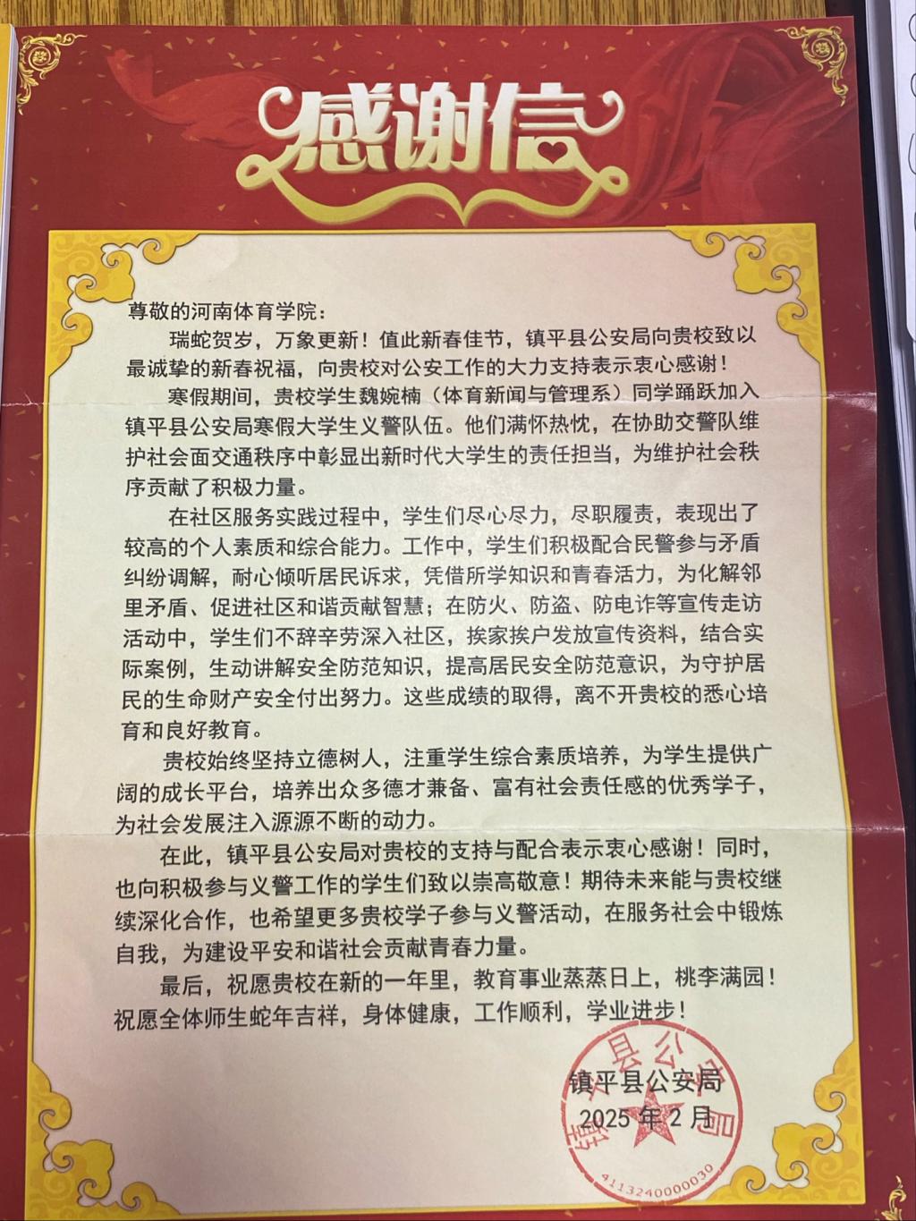 近日,镇平县公安局向河南体育学院发送感谢信,高度赞扬我院体育新闻与管理系2024级新闻二班魏婉楠同学在寒假期间踊跃投身义警工作的积极表现,并致以诚挚感谢。