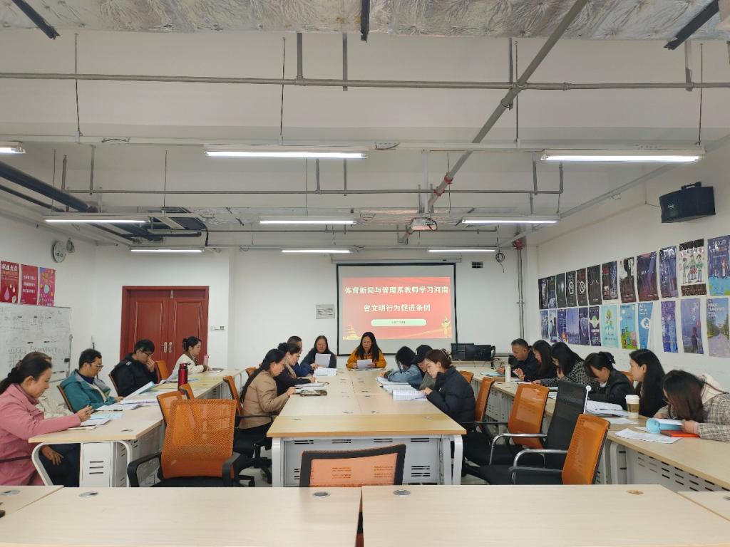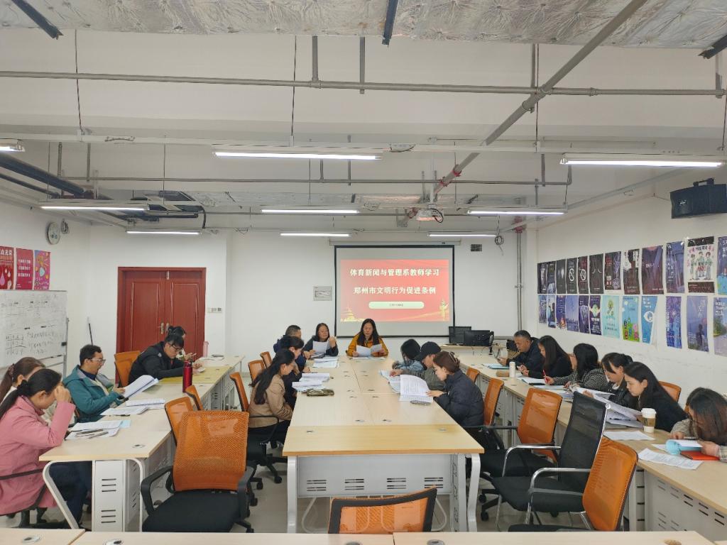 会议围绕两项《条例》的出台背景、核心内容及现实意义展开深入学习。与会人员一致认为,《河南省文明行为促进条例》和《郑州市文明行为促进条例》为引导社会文明风尚、提升公民素养提供了明确规范,是推进精神文明建设法治化的重要举措。系书记郜攀峰强调,全体教师应率先垂范,将《条例》精神融入教育教学、管理服务及日常言行中,引导学生践行社会主义核心价值观,自觉遵守公共秩序、维护环境卫生、文明使用网络,共同营造文明和谐的育人环境。系主任邓峰指出,需结合学科特点,在体育赛事报道、场馆管理、公众传播等专业实践中强化文明意识,展现师生良好精神风貌。