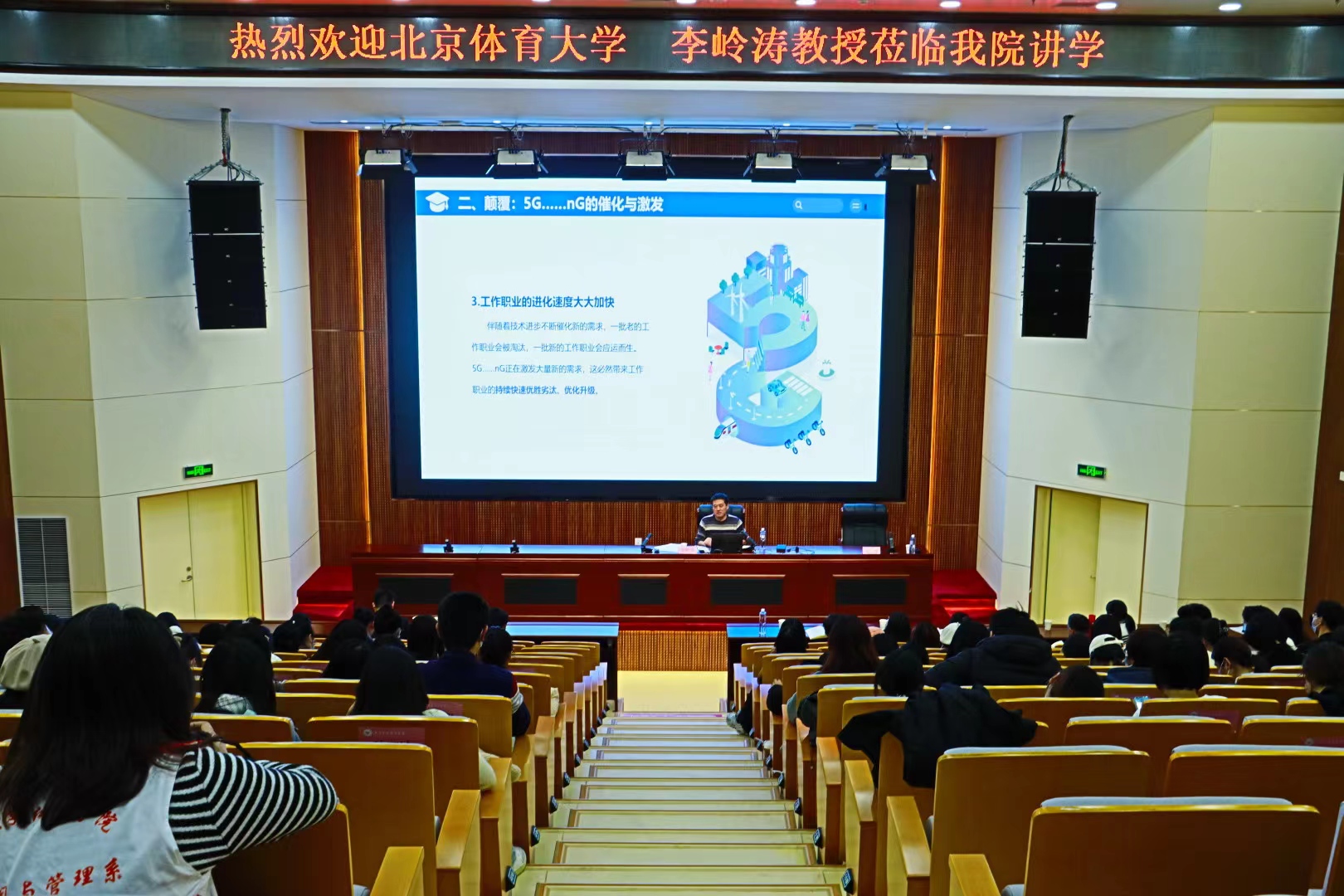 系主任邓峰致欢迎词并主持此次学术活动,李岭涛教授以《从5G到nG社会图景的颠覆与重塑》为题,从北京冬奥会、杭州亚运会高新技术运用及5G到nG的非技术意义引入。以5G催化和激发出全方位、深层次、无盲点的变化为基础,针对体育新闻传播学与5G技术及未来新技术的融合和发展趋势,从解读、颠覆、重塑、伦理、预测五个方面向同学们讲解。在5G到nG及相关技术的加持下,虚拟世界与现实社会的融合趋势、信息形态的演进趋势互相作用,将使得现实物体与自己镜像孪体的组合成为未来社会的基本单元和组成单位;5G到nG将会创造无限可能。同时告知同学们当应对新技术时的两种基本思路:“自下而上 —— 后面追赶”“自上而下 —— 前面引领”。