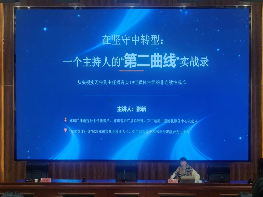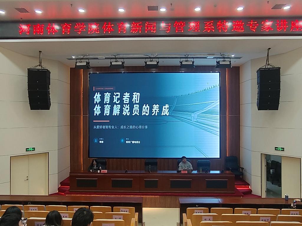 12月29日,体育新闻与管理系在图文楼负一楼报告厅举办教学实践周专家指导讲座。本次讲座由系主任邓峰主持,特邀郑州广播电视台主任播音员、郑州音乐广播总经理张新,以及我系优秀校友、体育记者兼解说员李澎担任主讲嘉宾,围绕媒体行业发展趋势与体育新闻人才培养展开深入分享。