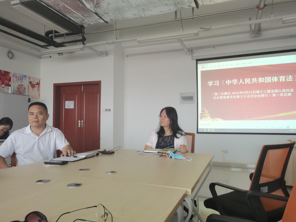 2022年8月26日上午,新管系在图文信息大楼617室召开2022年第三季度教师党支部党员大会。系主任、教师党支部书记邓峰同志倡导党员参加由中共河南省委宣传部主办、“学习强国”河南学习平台承办的“喜迎二十大 中原更出彩”“学习强国”河南学习平台答题比赛。党总支副书记、副主任王俊峰同志带领学习2022年6月24日第十三届全国人民代表大会常务委员会第三十五次会议修订的《中华人民共和国体育法》第一章总则。
