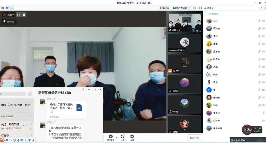 学习之余,赵环书记对新管系落实“双报到”有序开展志愿服务情况进行点评。鼓励广大师生党员、入党积极分子充分发挥体育人的优势和特长,有效利用微信公众号、视频号等,广泛宣传居家健身、科学锻炼知识,倡导健康生活方式,增强群众免疫力。