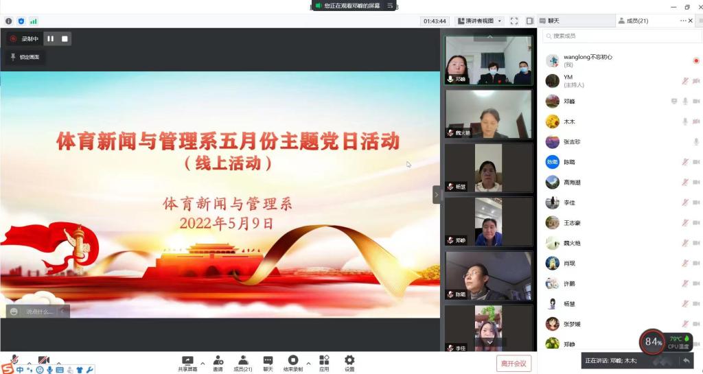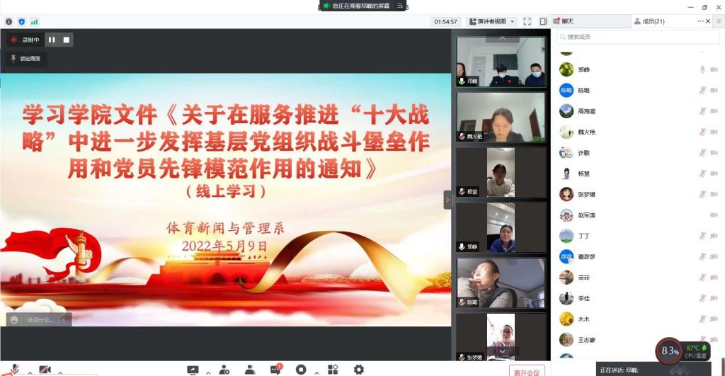 5月9日上午,体育新闻与管理系党总支开展主题为“学战略、比担当、干出彩”主题党日活动。本次认真学习《中共郑州大学体育学院委员会关于在服务推进“十大战略”中进一步发挥基层党组织战斗堡垒作用和党员先锋模范作用的通知》,根据党员近期收看“十大战略”专题讲座情况,近期的“能力作风建设年”活动情况开展线上讨论。