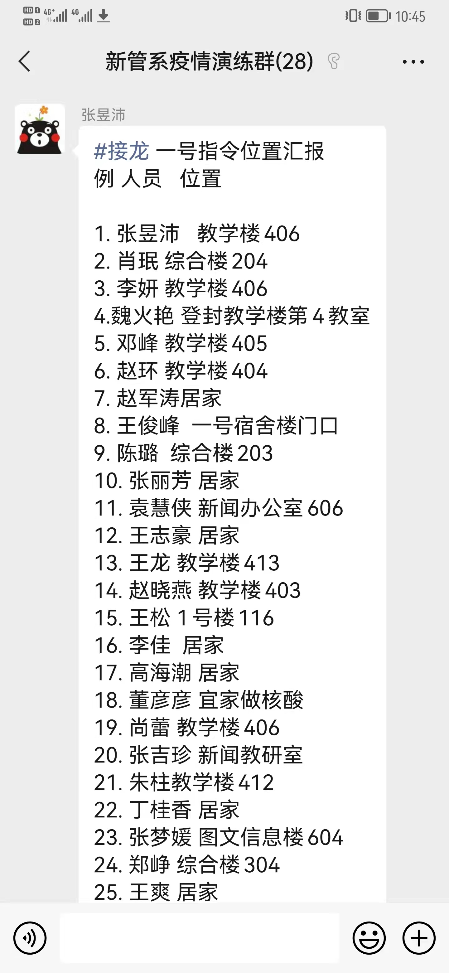 演练活动主要是模拟正常工作的情况下,新管系党总支书记赵环同志发出“突发新冠肺炎疫情防控”指令后,系主任、教师党支部书记邓峰带领全体教师接到第一指令和接到上级的下一步行动指令之间的工作演练。通过本次演练,使我系教师党员进一步熟悉掌握了“突发新冠肺炎疫情防控应急响应”一小时内的工作步骤和注意事项。演练内容包括:统计师生位置、学生专班人员第一时间前往宿舍、网格长上报学生实时数据信息、教师在课堂上安抚学生情绪和舆情引导等一系列具体操作流程。确保在等待学院新冠肺炎疫情防控指挥部的下一步行动指令前的各项准备工作。