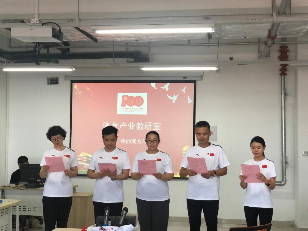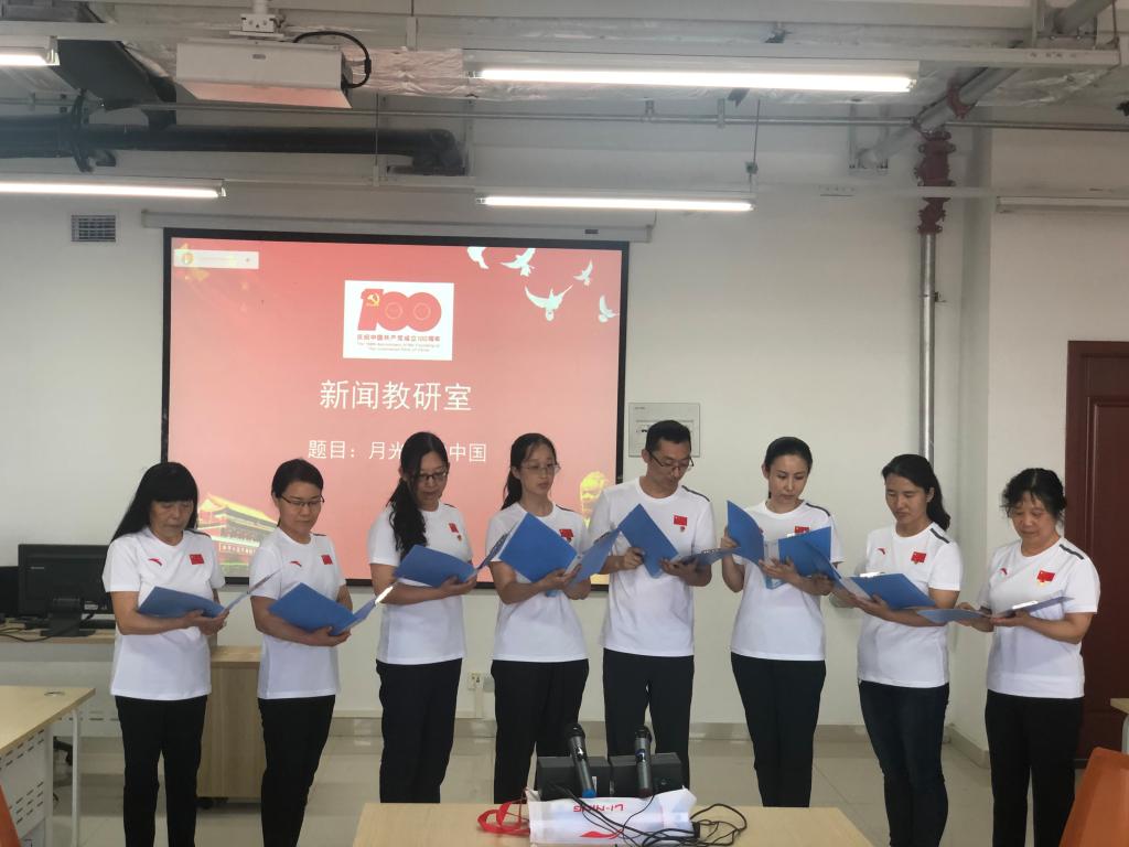 随后,新闻教研室带来了诗朗诵《月光下的中国》,管理教研室带来了诗朗诵《颂歌献给党》,体育产业教研室带来了诗朗诵《我的南方与北方》,新管系系办带来了诗朗诵《党旗飘扬》。活动中,大家统一身着中国字样的服饰,胸前佩戴着党徽、贴着国旗彩贴,在热情激昂的朗诵声中拉开了我系喜迎建党100周年主题党日活动的篇章。