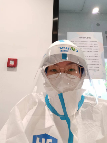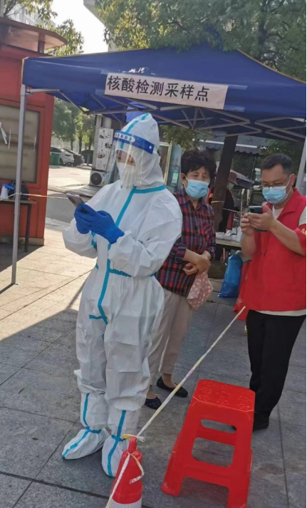 陈芸在郑州市金水区东风路大河春天社区核酸检测点参加志愿者活动