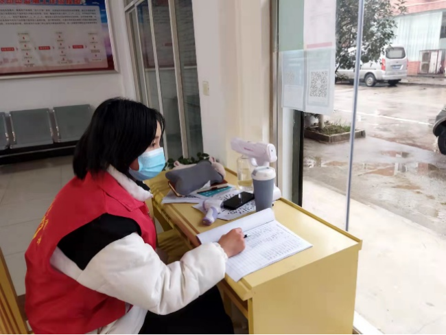 曹颖在信阳市浉河区谭家河南湾村疫情期间在村部参加志愿者活动