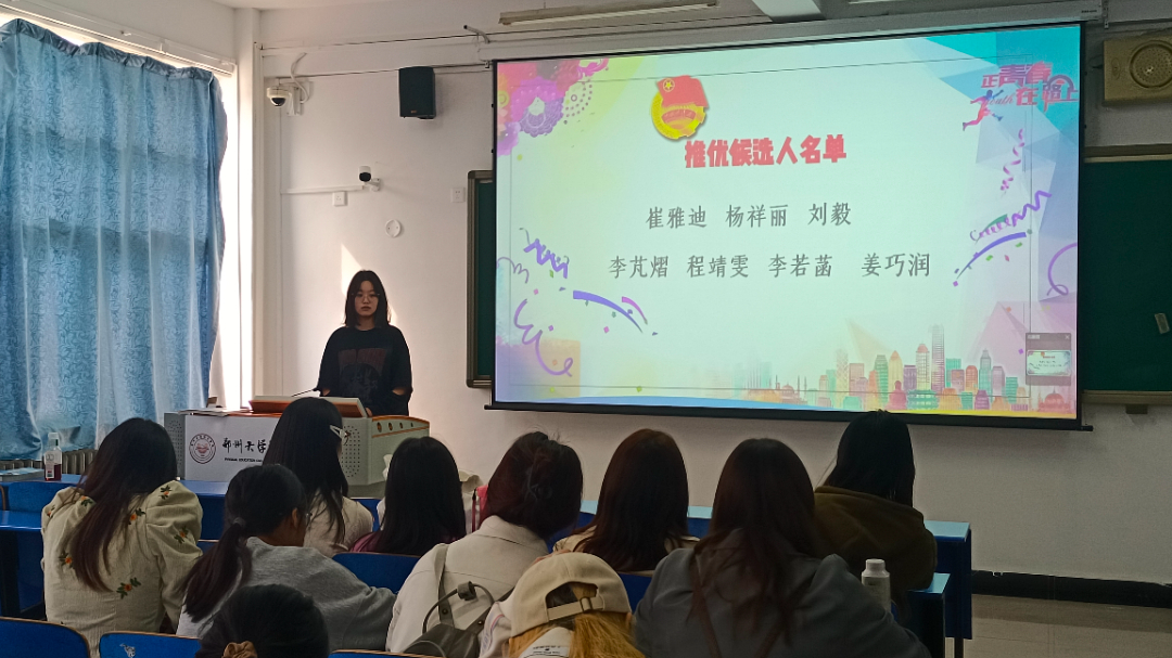 会议开始,张静老师对近期团工作进行了总结,并围绕团员推优和评选等方面做了详细讲解,主要介绍了团员推优所需要的条件和流程。本次团员推优奉行全过程民主,采用匿名投票的方式,全过程透明,遵循民主的意见。