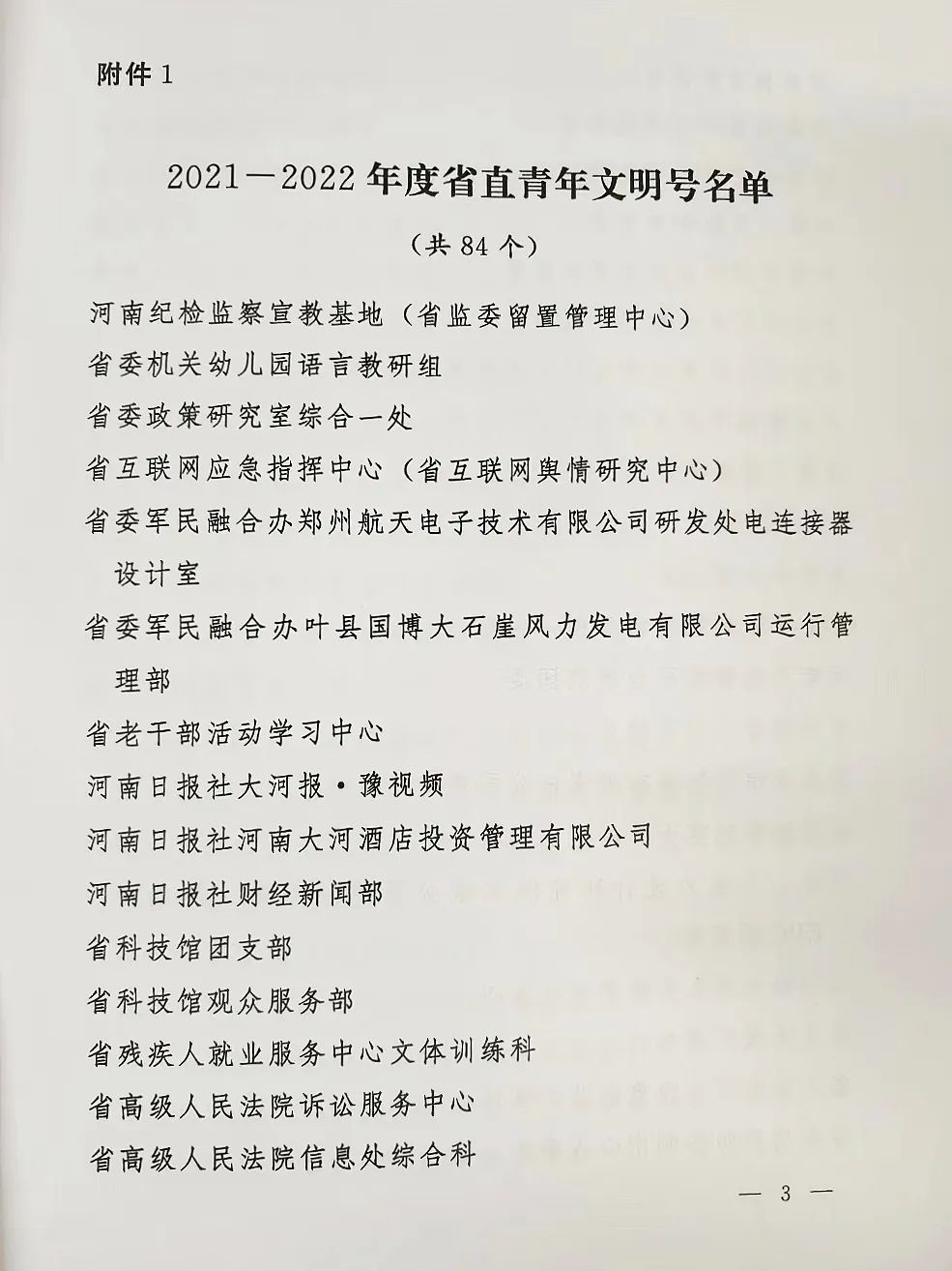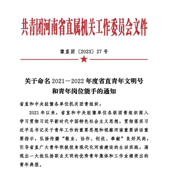 近日,共青团河南省直属机关工作委员会印发《关于命名2021—2022年度省直青年文明号和青年岗位能手的通知》(豫直团〔2023〕27号),我系团总支荣获“2021—2022 年度省直青年文明号”荣誉称号。