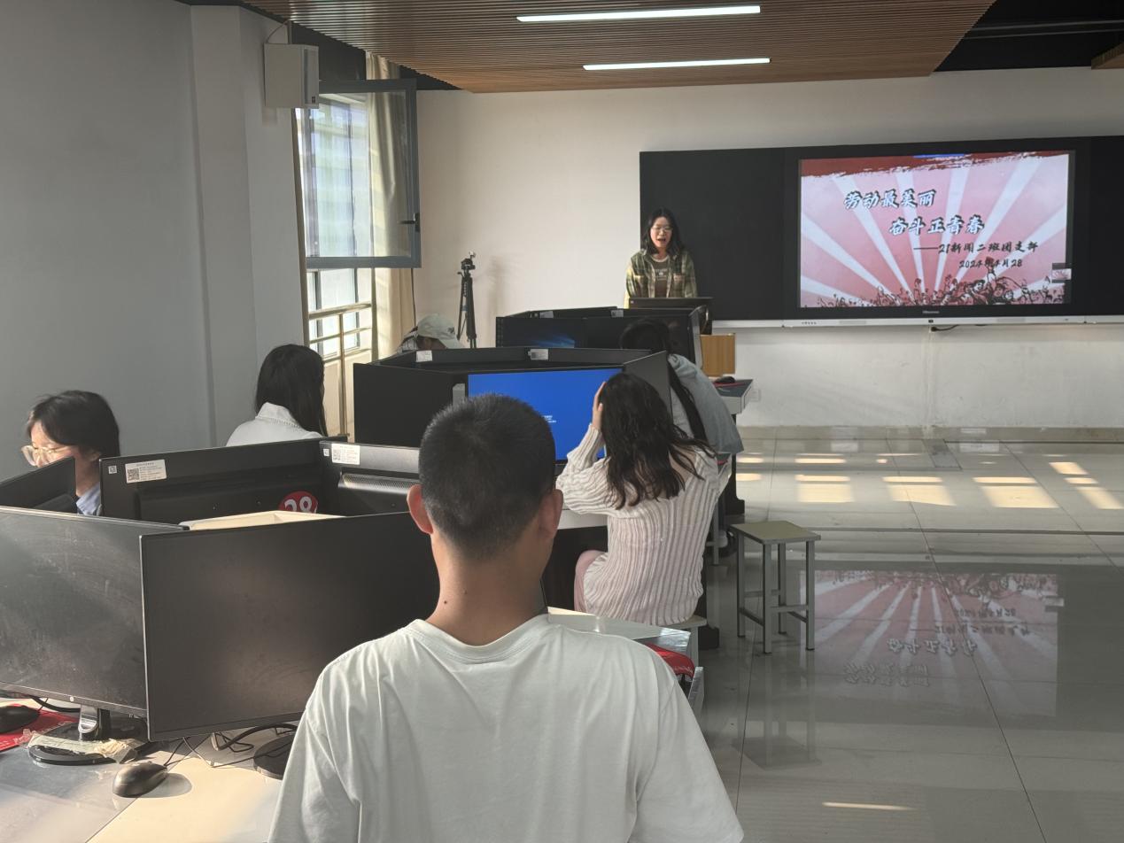 会议记录:21级新闻一班在新闻实训室开展五月份主题团日活动。恰逢“五一劳动节”来临之际,21新闻一班团总支以劳动节为契机,开展“强化奋斗意识—劳动最美丽 奋斗最青春”的主题班会。此次班会由张戈主持,陈玉洁主讲,分别从讲解习总书记关于劳动的重要论述、观看“两红两优”人物事迹、鼓励广泛开展劳动、引导教育团员和青年传承和弘扬劳模精神四个方面进行。此次主题班会全员参与,同学们反响良好,纷纷表示要更为积极的参与劳动。