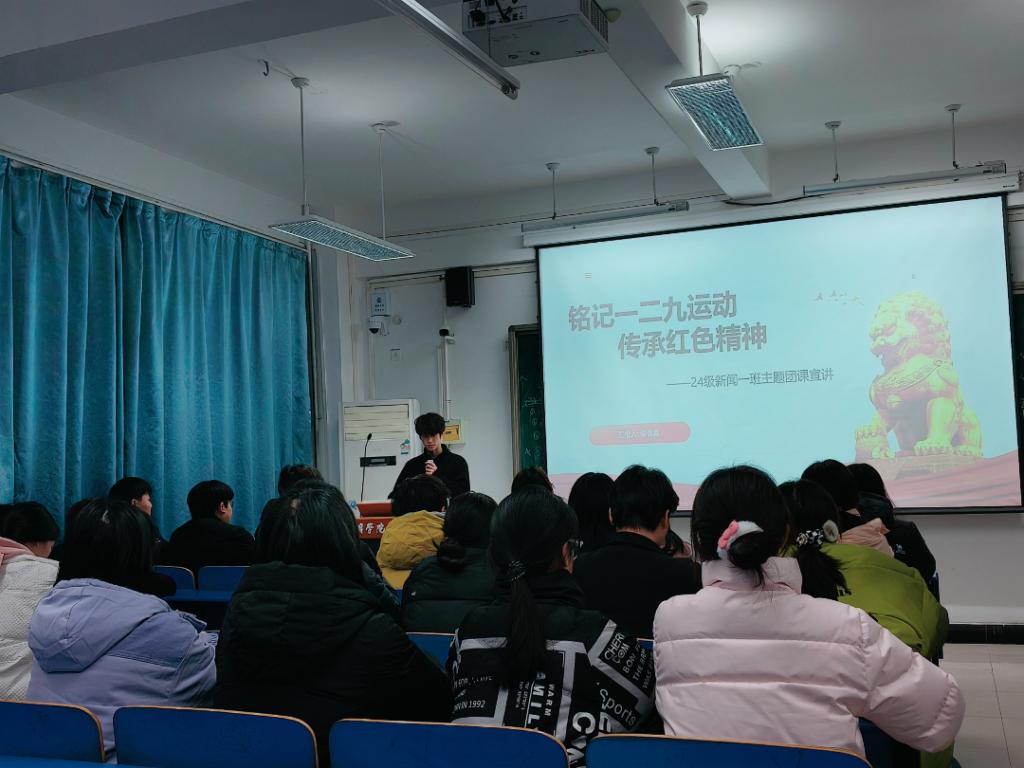 24级新闻一班团支书李佩霖以“铭记‘一二·九’ 共筑五史魂”为主题召开团会,会议从‘一二·九’运动的背景、过程、意义、影响、青年的铭记与传承等五个方面进行详细讲解,使同学们深入了解“一二·九”运动及党史知识,拓宽历史视野,丰富知识储备。