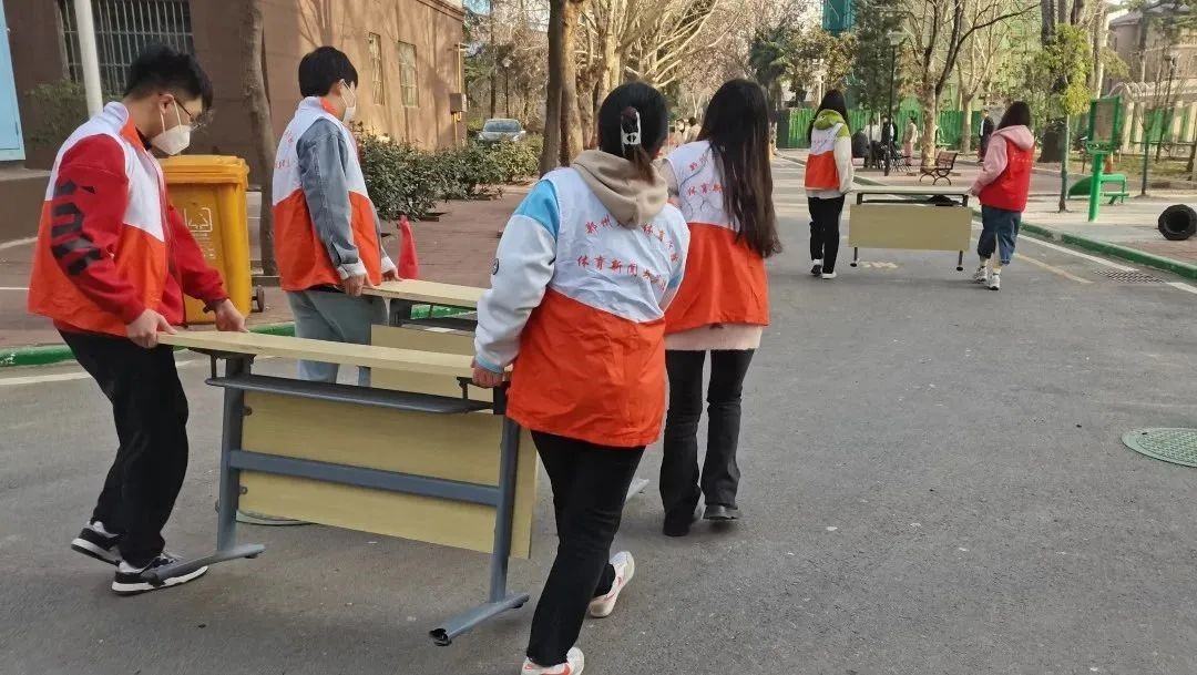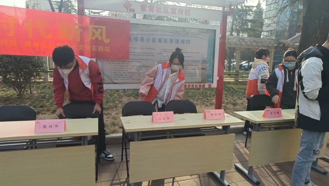 3月5日上午8时,志愿者们提前到达长兴路街道常青社区金桂苑南区小广场,在活动开始之前,志愿者们同社区工作人员一起布置现场,摆放桌椅,粘贴横幅,搬运物资。