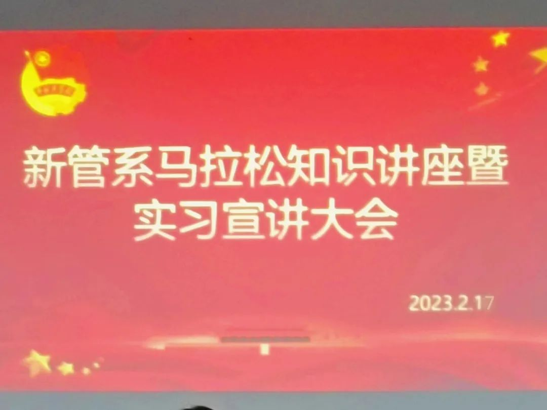 2023年2月17日晚,新管系组织开展了马拉松知识讲座暨实习宣讲大会。本次会议我们邀请到我系实习基地之一的大河搏冠公司负责人刘杉作为此次知识讲座的主讲人。我系20级、21级全体同学以及辅导员张静老师参与本次讲座。