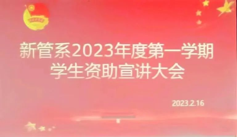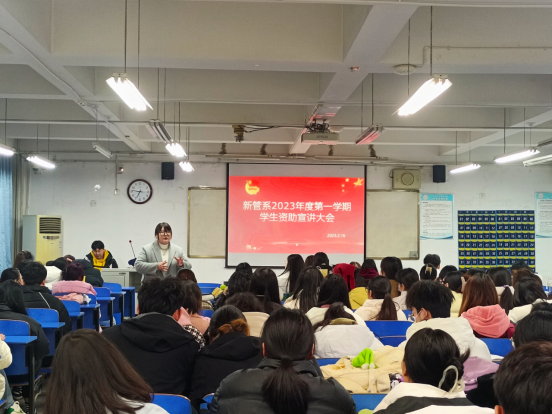 2023年2月17日晚,新管系20、21级全体同学在辅导员张静老师的带领下开展了新管系2023年度第一学期学生资助宣讲大会。