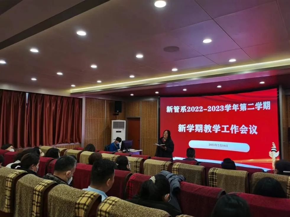 随后,新管系主任邓峰同志回顾和总结了上学期工作情况,安排了本学期重点工作。邓峰主任强调,要做好期初教学准备工作,规范课堂教学管理,扎实推进教研活动。同时,本学期要将强化课程建设、凝练专业特色、提升教师教学能力作为重点工作,试行“导师制”和“分段实习”,促进教学质量稳步提升。