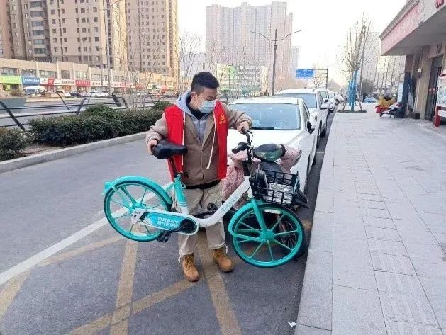 21级公管一班戴贺翔同学协助街道非机动车规范停放