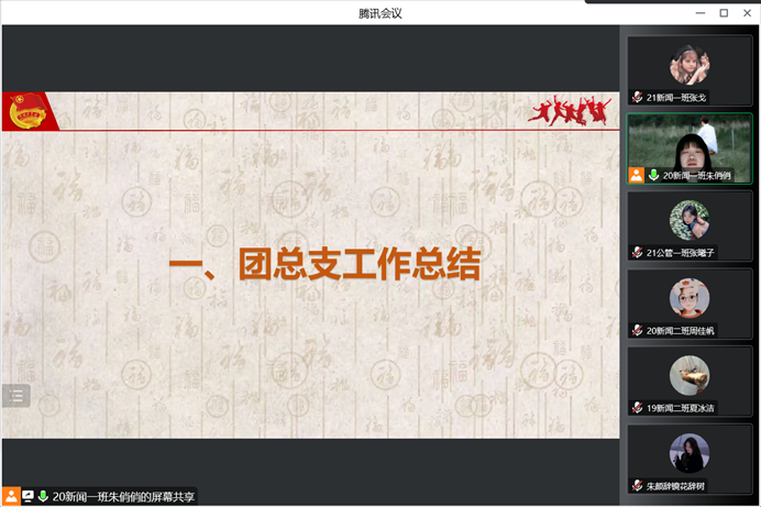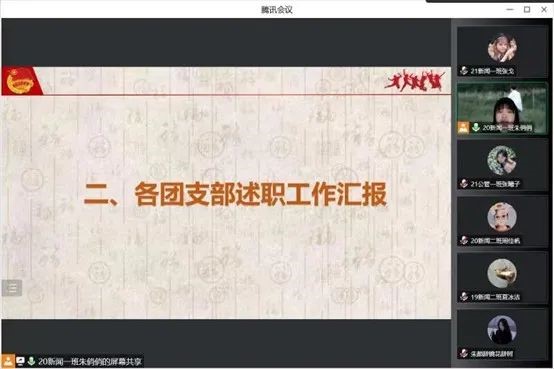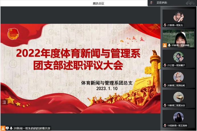 回顾过去一年的工作历程,我系团总支立足实际、开拓创新、紧跟时事开展了一系列团学工作,充分发挥了团作为党的助手和后备军的作用。为深刻总结自我,贯彻落实学院团委《关于基层团组织书记述职评议考核工作的通知》要求,2023年1月10日19时,我系团总支组织各团支部书记在腾讯会议线上召开“体育新闻与管理系班级团支部述职评议大会”。