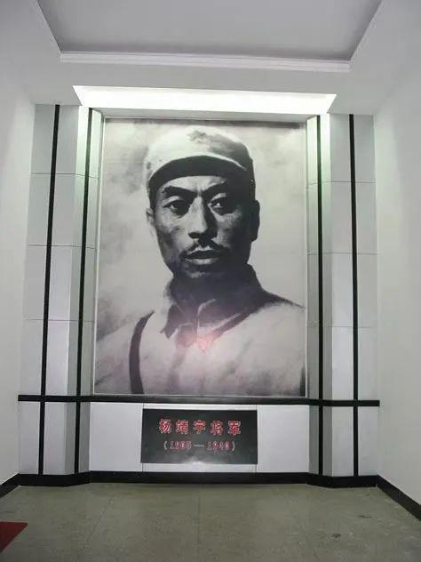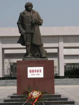 馆内庭院中央杨靖宇将军的雕像和馆内杨靖宇将军的照片