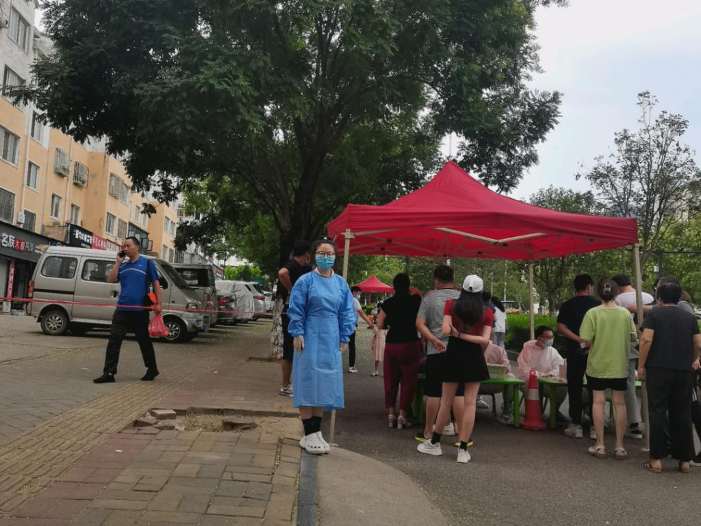 参加本次新管系“爱千里”暑期社会实践活动的小分队成员们在各自社区分配的核酸检测地点做志愿者,主要负责负责维持现场秩序,引导核酸队伍进行分组检测,并对核酸检测人员的场所码进行检查。
