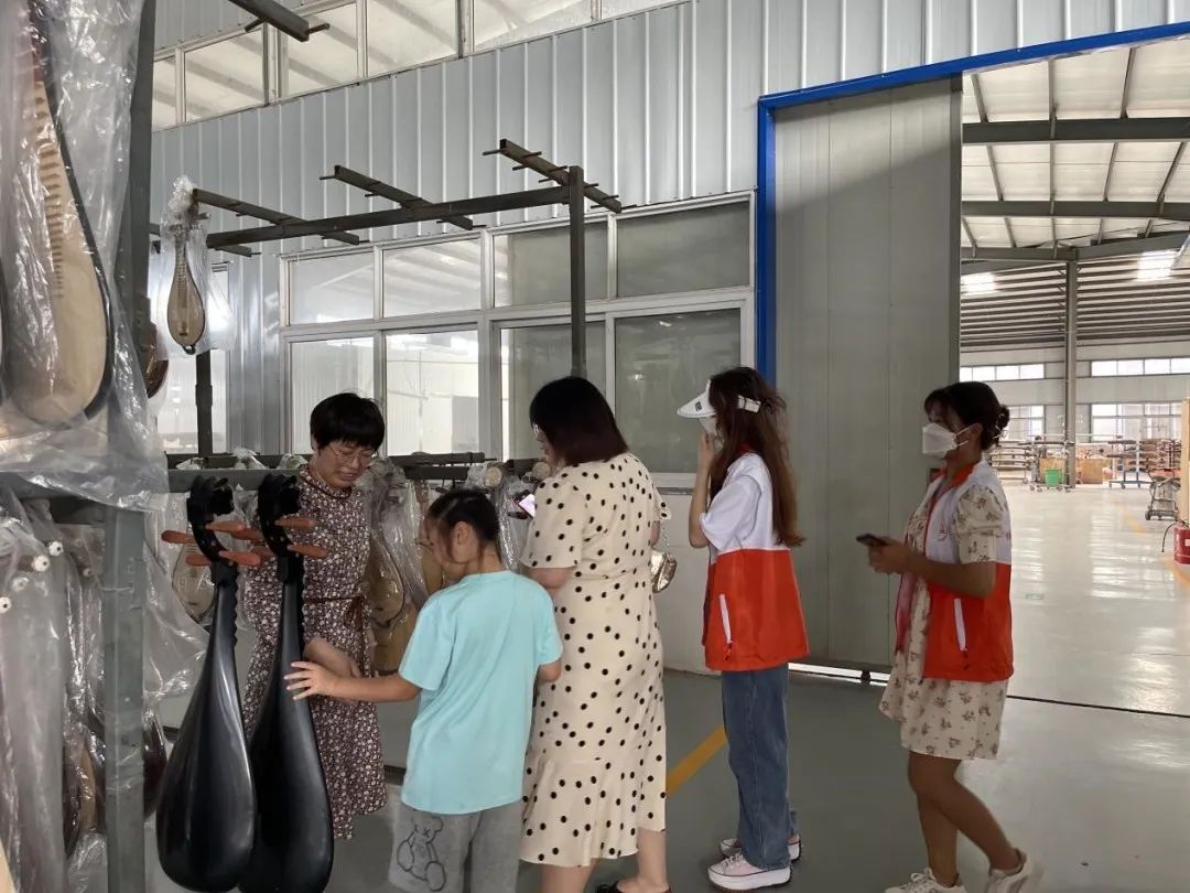 志愿分队先前往河南中州民族乐器有限公司进行参观学习,河南中州民族乐器有限公司,由代士永先生始建于1988年,是河南兰考著名产业,在国内属规模最大的有限公司之一,主要生产古筝、琵琶、扬琴、阮、二胡等多种产品,其音板多为桐木制作。20世纪80年代,一位上海乐器师傅发现,泡桐板材适合做乐器的音板。而长在黄河故道沙土中的兰考泡桐,纹路清晰,板材音质奇佳,在全国也是独一无二的。这位乐器师傅在徐场村找到了从事桐木板材加工的代士永,此后,代士永成为上海制造乐器厂家的原材料供应商。与乐器厂深入接触后,代士永得知乐器成品竟可卖到高价,便决心独立办厂。1988年,他从上海、扬州高薪聘请了几位师傅,在兰考开办了第一家制造乐器的中州民族乐器厂。