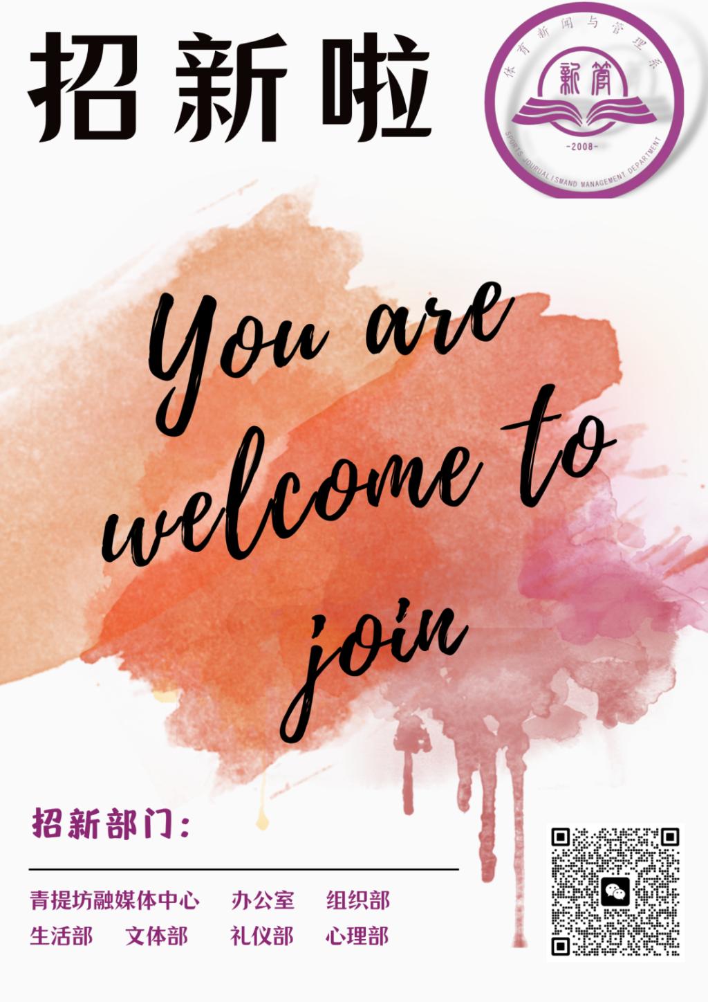 新管系学生会青提坊融媒体中心分为编辑组、排版组、视频剪辑组、海报组和审核组。