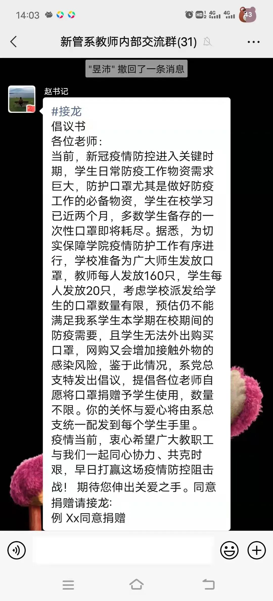 近期疫情形势严峻,为加强疫情管控、解决同学们的实际需要,学校给每位在校生免费发放口罩20只,我系全体教师积极响应党总支号召,纷纷将自己分到的口罩全部捐赠给在校学生。