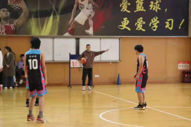 比赛开始,只见球员噔的一下双手抱住球,一个转身投球,霎那间球飞入篮筐。随着场边同学们的欢呼声,第二次攻势席卷而来,球员们接转配合,运球向篮板攻去。