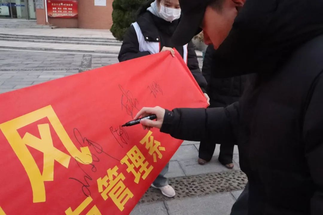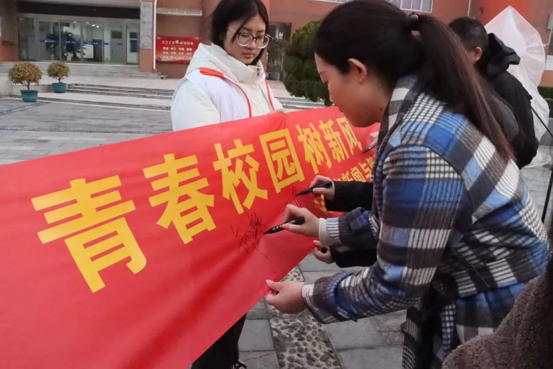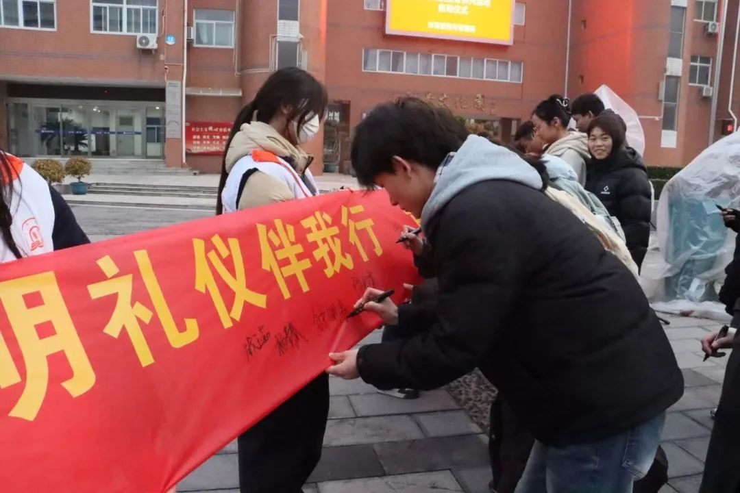 最后,师生代表进行签名。领导老师们以身作则,带领学生代表们有序地走向写有“文明礼仪伴我行,青春校园树新风”的横幅。他们郑重地签下名字,每一个签名都是对文明礼仪的坚守,彰显了体育新闻与管理系师生团结一心、崇尚文明的精神风貌。
