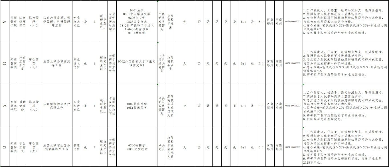 本次招聘共设置27个职位、拟招聘工作人员102名,具体职位信息及资格条件详见《郑州警察学院2025年度公开招聘人才计划表》(见附件)。