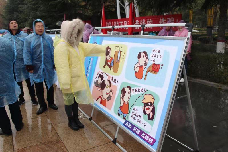 放置在大河广场四周的防诈骗宣传展览牌,向参加此次活动的警民、学生及老人们讲解了常见的诈骗手段,让广大民众更加警惕诈骗,提高防诈骗意识,增强民众的安全观念。我系学生在雨中认真阅览了标栏上的内容,对一些常见的诈骗手段有了更充分的认识和了解。