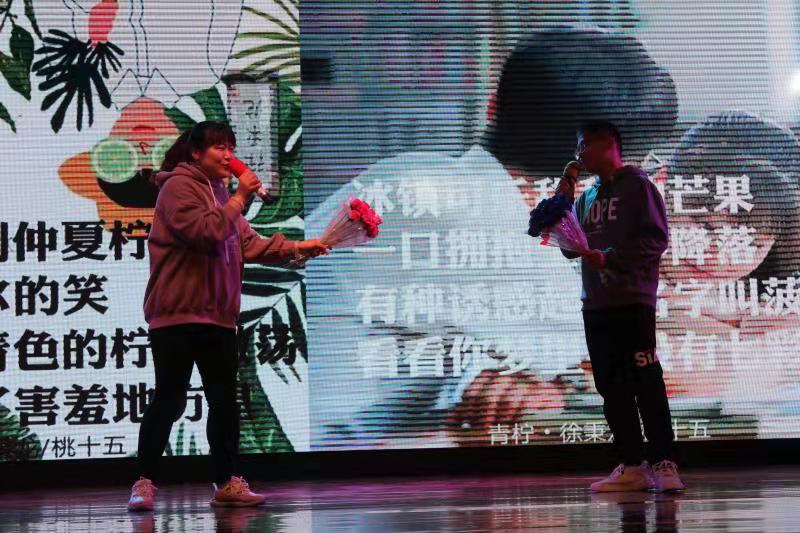 现场气氛越唱越热,越唱越嗨!一首由日月星辰演唱的《暗香》收到了本场的第一束鲜花。上半场结束后,神秘嘉宾张静老师与18级新闻一班选手张裕合唱了一首《青柠》,更是嗨爆全场,引发全场互动。同时现场互动环节也在火热进行中,主持人在微信墙上随机抽取了幸运观众进行互动并颁发精美礼品。
