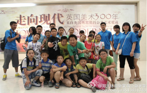 2013年7月15日上午10点,郑州大学体育学院体育新闻与管理系的“公益学堂,共同成长”志愿者们领着中小学生去参观郑州市英国美术300年画展,志愿者们在此期间了解了英国美术的历史,学会了怎样讲述英国与中国的历史。更重要的是,他们学会了如何去服务他人。
