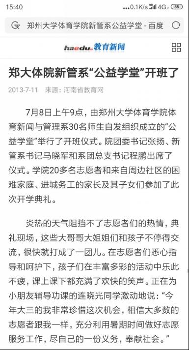 2013年7月11日,郑州大学体育学院体育新闻与管理系“公益学堂”由教育新闻网独家报道。