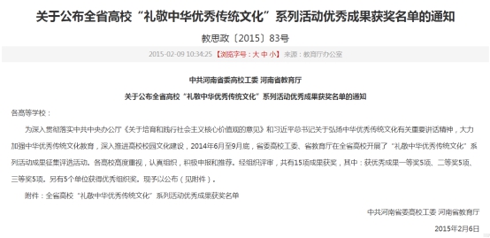 2015年2月6日,郑州大学体育学院体育新闻与管理系“公益学堂”获得全省高校“礼敬中华优秀传统文化”三等奖。