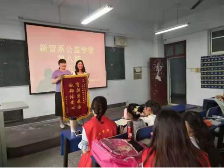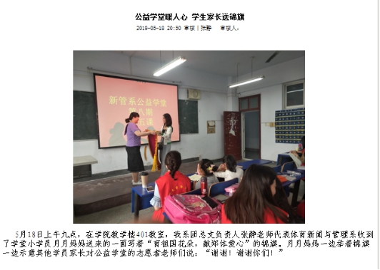 2019年5月18日上午九点,郑州大学体育学院教学楼401教室,我系团总支负责人张静老师代表体育新闻与管理系收到了公益学堂小学员月月妈妈送来的一面写着“育祖国花朵,献郑体爱心”的锦旗。