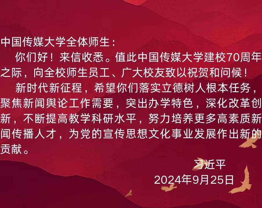 近日,中共中央总书记、国家主席、中央军委主席习近平给中国传媒大学全体师生回信,在中国传媒大学建校70周年之际,向全校师生员工、广大校友致以祝贺和问候。
