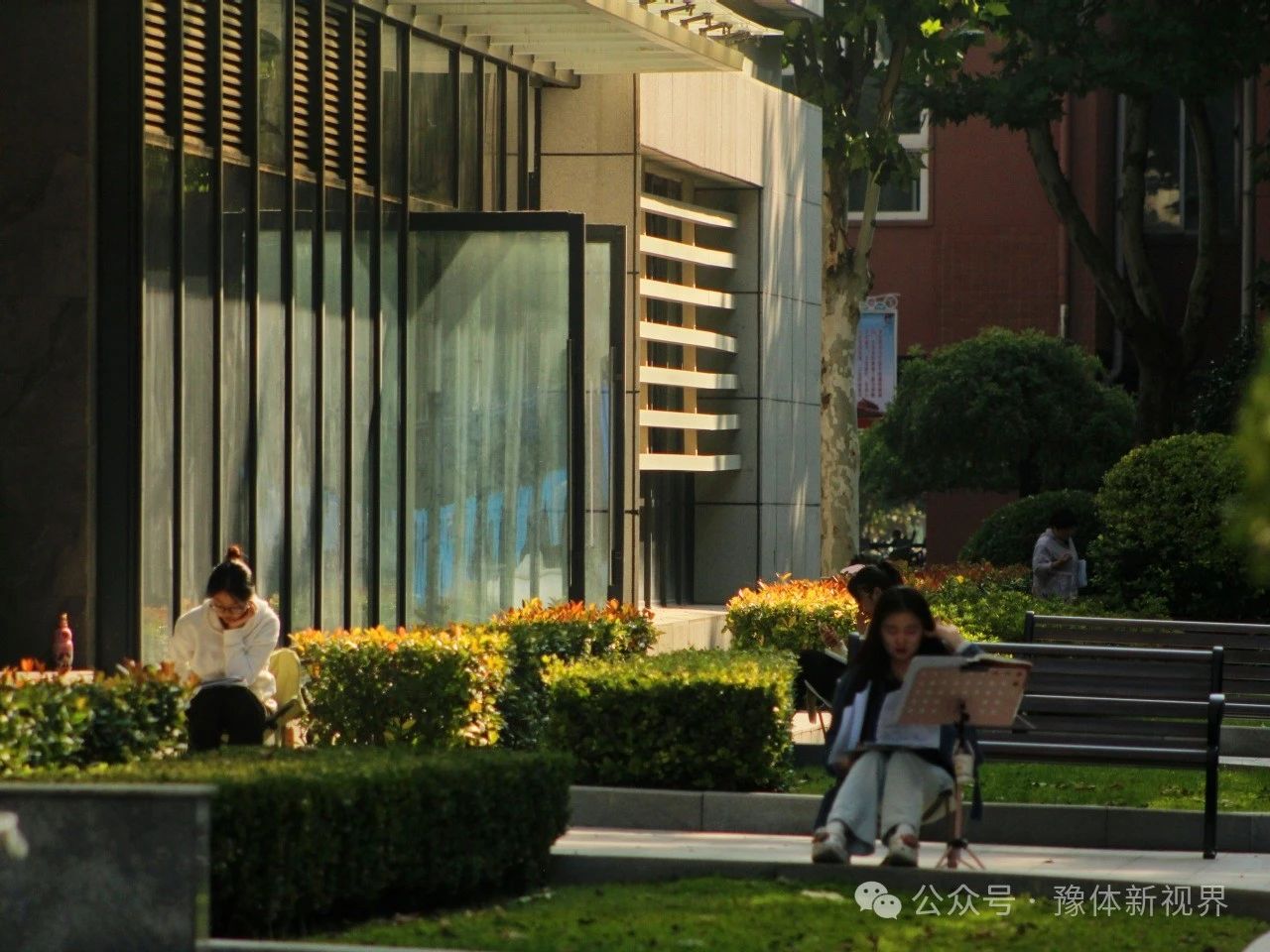 柔和的晨光轻轻洒落在青翠的草坪和教学楼上,为整个校园披上了一层淡淡的金辉。画面中央,学生们或坐或立,手中紧握着书本,全神贯注地背诵着课文或单词,浓厚的学习氛围扑面而来。