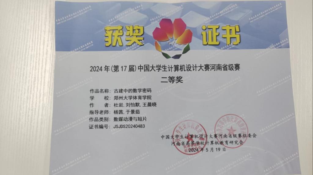 2024年5月18日,由中国大学生计算机设计大赛河南省级赛组织委员会、河南省高等学校计算机教育研究会主办,郑州航空工业管理学院承办的“2024 年(第 17 届)中国大学生计算机设计大赛河南省级赛”在郑州航空工业管理学院举行。本次大赛激励大学生学习计算机知识、技术、技能的兴趣和潜能,培养其创新创业能力及团队合作意识,运用信息技术解决实际问题的综合实践能力,以提高其综合素质,造就更多的德智体美劳全面发展、社会就业需要、创新创业型、实用型、复合型人才,来自河南省内在校各本、专科专业学生参加。经过激烈角逐,郑州大学体育学院体育新闻与管理系学生杜岩、刘怡默、王晨晓的参赛作品《古建中的数学密码》获得省二等奖。