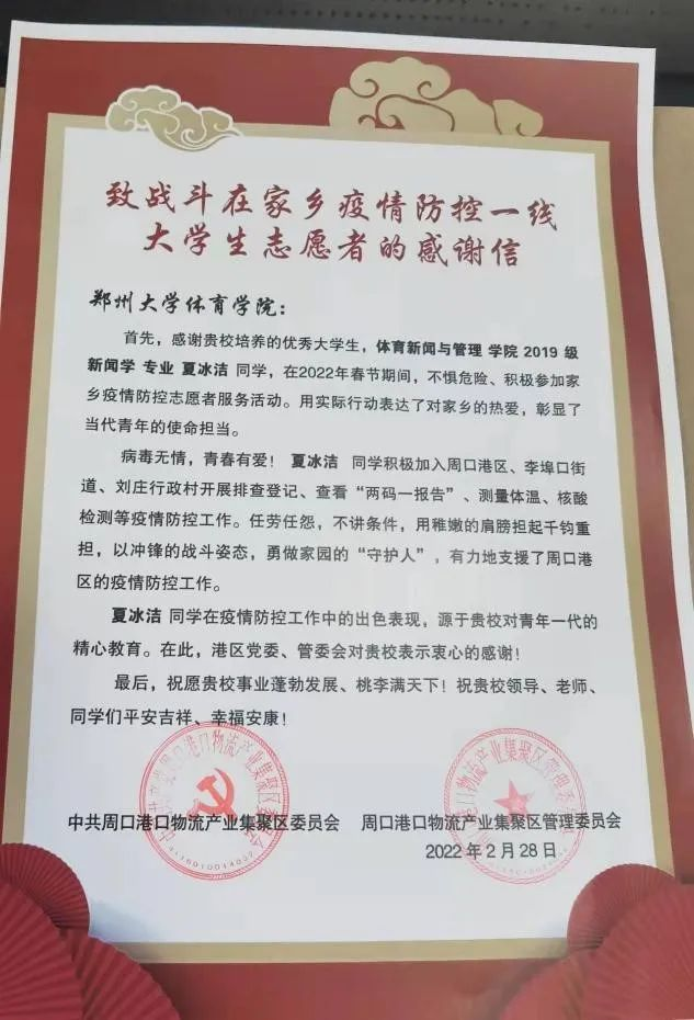 2022年寒假期间,新冠肺炎疫情又一次席卷河南省多地,为响应家乡周口市地区疫情防控志愿者服务号召,夏冰洁积极主动参加为期数十日的周口市川汇区李埠口乡地区疫情防控志愿服务。在周口港口物流产业聚集区等地开展排查登记、测量体温、核酸检测等疫情防控工作,为家乡群众的生命安全建立起一道坚强的防线。在战“疫”一线擦亮青春底色,默默诠释着“奉献、友爱、互助、进步”的志愿服务精神。