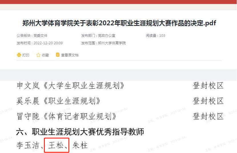 3.我单位青年教职工王松老师在我院2022年职业生涯规划大赛中表现优秀,荣获职业生涯规划大赛优秀指导教师荣誉称号。