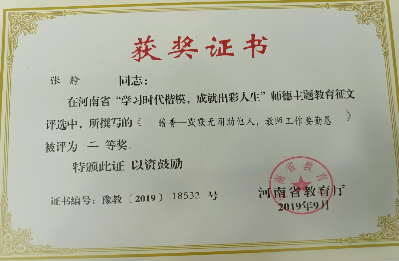 10.我单位青年教职工张静老师在河南省“学习时代楷模,成就出彩人生”师德主题教育征文评选中,荣获二等奖。