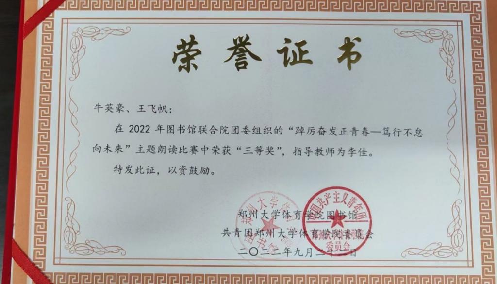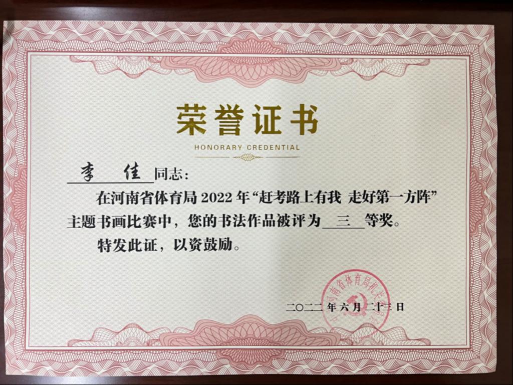 9.我单位青年教职工李佳老师2022年省体育局“赶考路上有我走好第一方阵”主题书画比赛获三等奖。